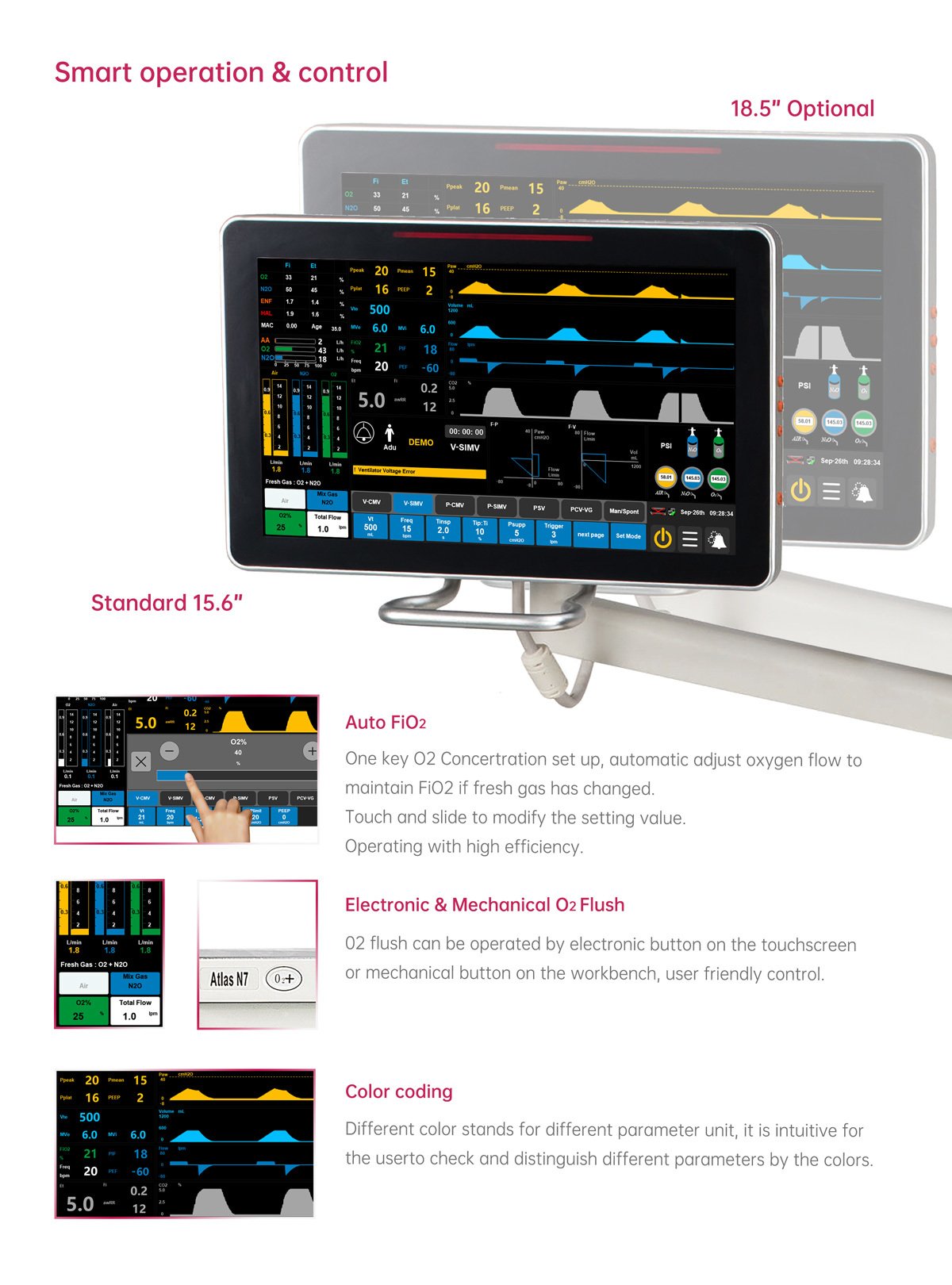 The Atlas N7 Anesthesia Machine is an advanced anesthesia workstation designed to deliver precise ventilation and reliable patient monitoring in operating rooms and critical care settings. Featuring a 15.6-inch TFT touchscreen and an integrated patient monitor design, it combines intuitive operation with comprehensive respiratory management for neonate, pediatric, and adult patients.