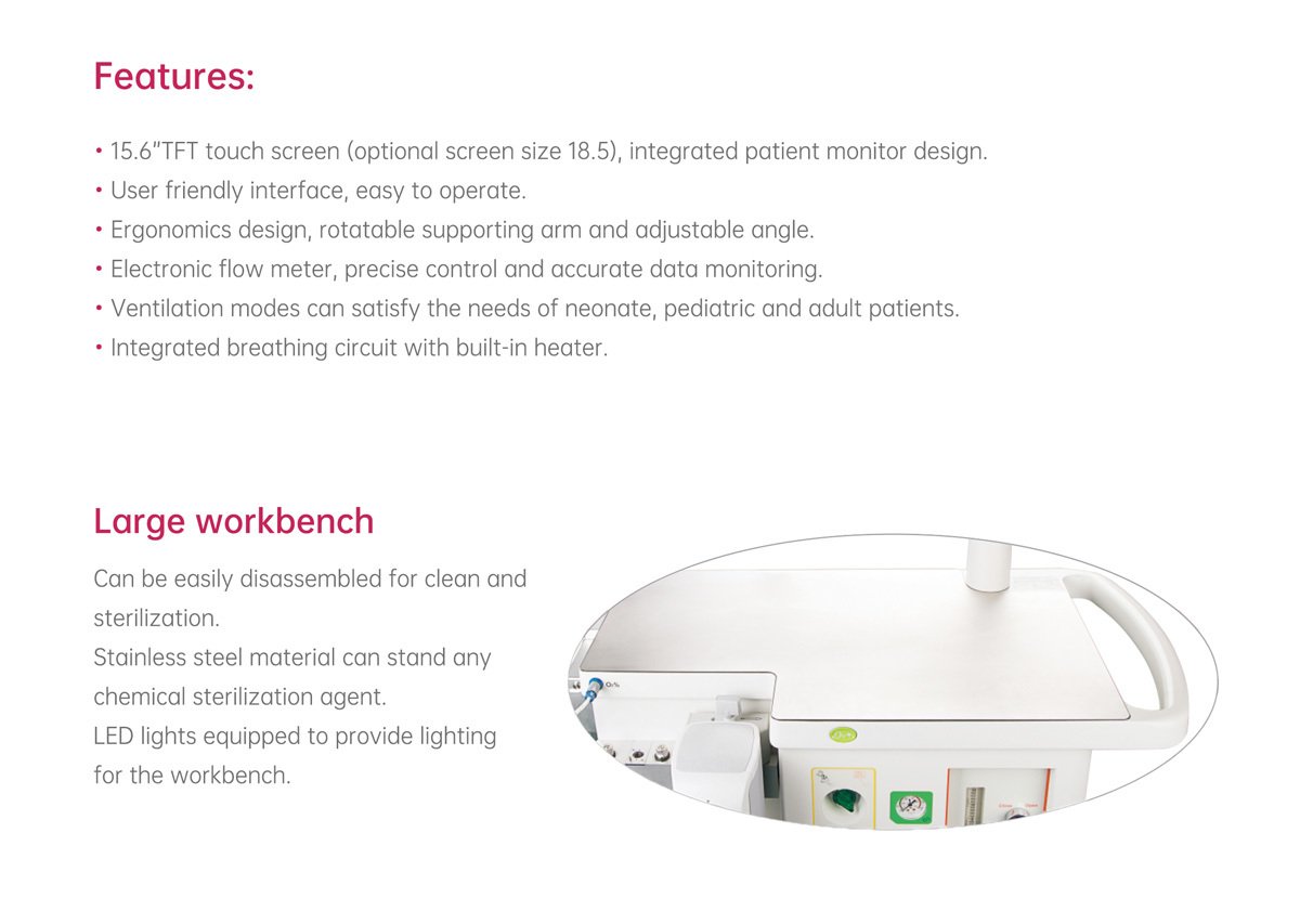 The system supports a wide range of ventilation modes, allowing flexibility across different patient conditions and surgical requirements. An integrated breathing circuit with a built-in heater further improves patient comfort and system performance during prolonged procedures.